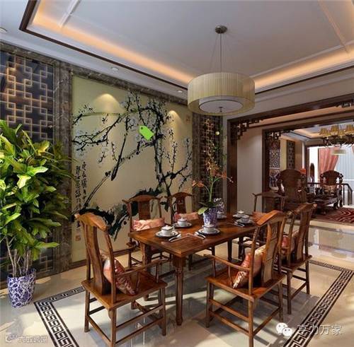 餐桌餐椅中式元素的运用,带来空间的典雅与禅意,很是清雅。背景墙的整幅梅花画作,展现了主人高洁不入流俗的品质。
