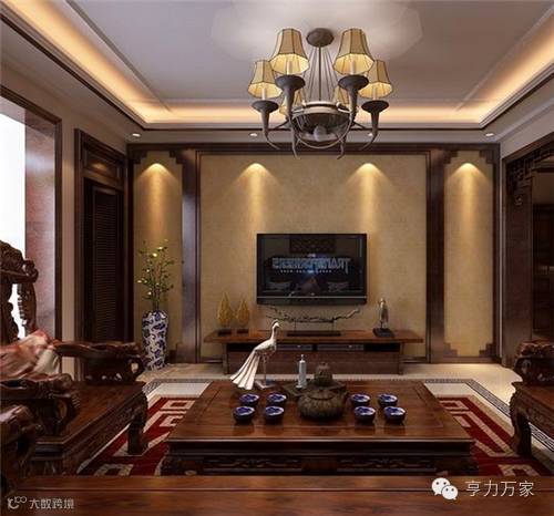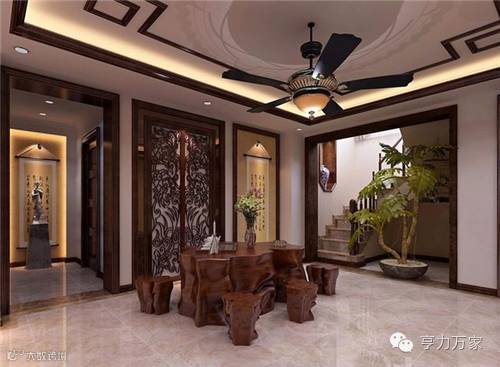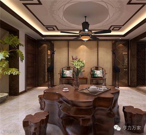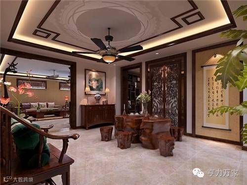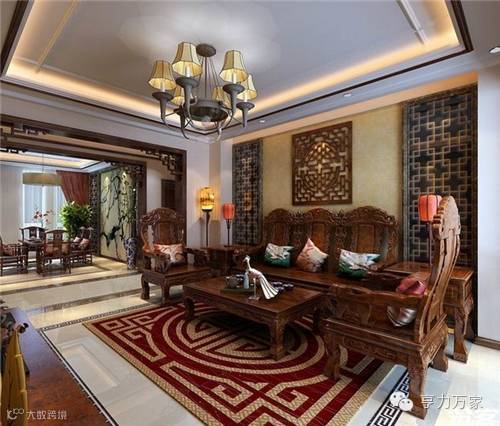 运用木质的座椅与茶几搭配主体空间,雕花的细致入微,很是清雅,彰显气场。背景墙的镂空花窗装饰其间,愈加清亮。