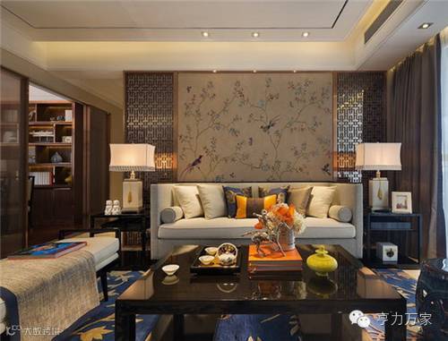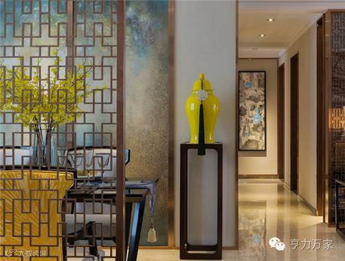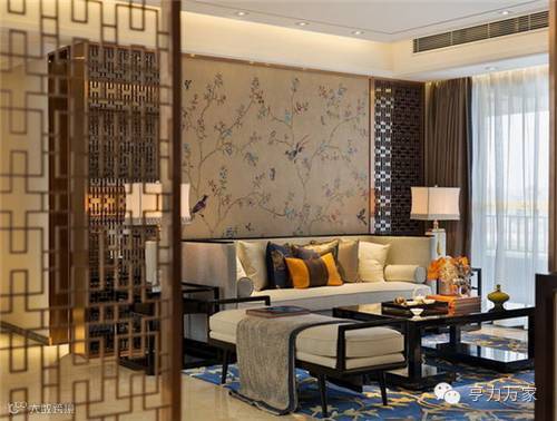 中式元素与现代材质的巧妙兼柔,茶几、窗棂、墙纸与布艺装饰相互辉映,再现了移步变景的精妙小品。