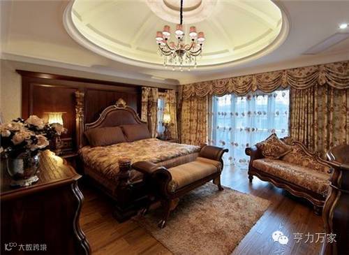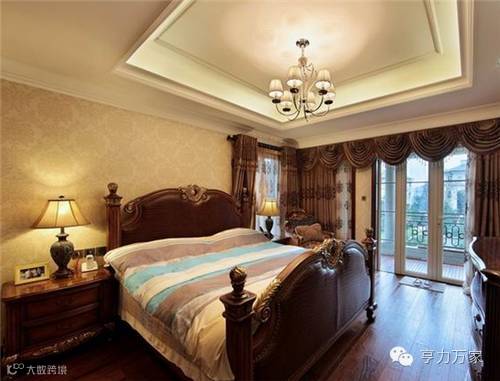 大地色成为卧室区域的主色调,渲染卧室温暖的感觉。简化的欧式传统四柱床凸显了新古典主义的风格,再加上铆钉的压边,透着时尚的气息。