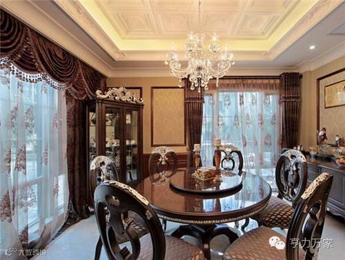 罗马帘、金属包边、水晶灯无一不在诉说新古典主义风格,有意思的是墙上的书法是关于中国传统的“孝”,挂在餐厅旨在提醒如今忙于工作的都市人,多抽空陪陪父母。