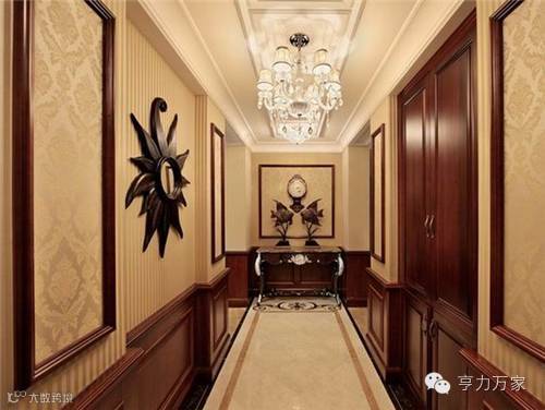 本区域和会客厅的动线是联系在一起的,过道采用了大量木质包边设计,体现出雍容庄重的感觉,太阳神的图腾也呼应了古典的风格。