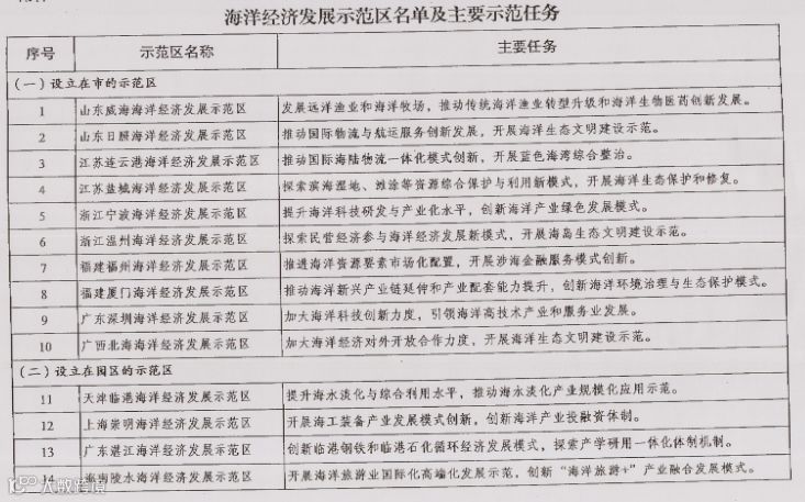 为贯彻落实党的十九大关于“坚持陆海统筹,加快建设海洋强国”重大决策部署,近日,国家发展改革委、自然资源部联合下发关于建设海洋经济发展示范区的通知,支持14个海洋经济发展示范区建设。山东省2个,分别是威海和日照;江苏省2个,分别是连云港和盐城;浙江省2个,分别是宁波和温州;福建省2个,分别是福州和厦门;广东省2个,分别是深圳和湛江;广西1个,是北海;天津1个,是临港;上海1个,是崇明;海南1个,是陵水。