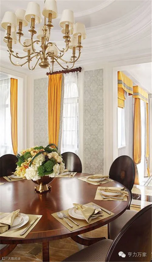 设计师通过主次分明的色彩配比关系来实现心情的旋律,使得整个空间都变得轻松又愉快,再结合以精致优雅的铜质吊灯,在暖暖灯光的烘托下,用餐都显得格外的愉悦。