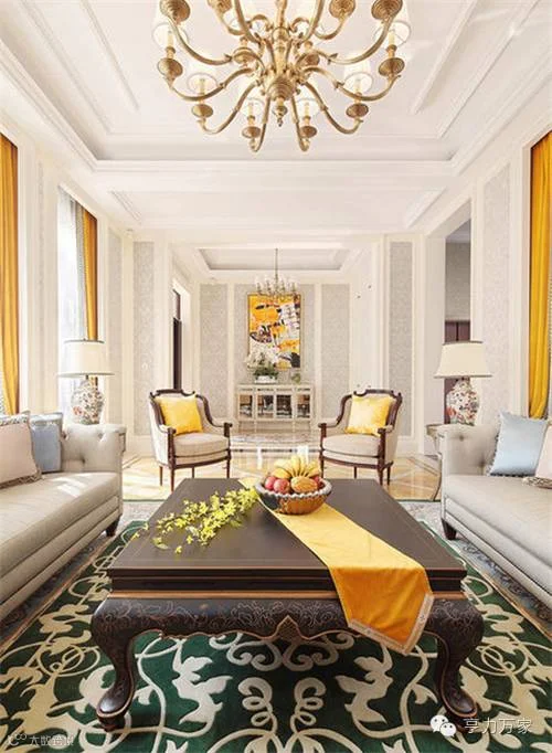 星星点点的明黄调在使人愉悦的同时散发着艺术气息,为整个空间的趣味时尚增色不少,使得整个客厅空间在保持庄重、大气的同时也不显得过分严肃。