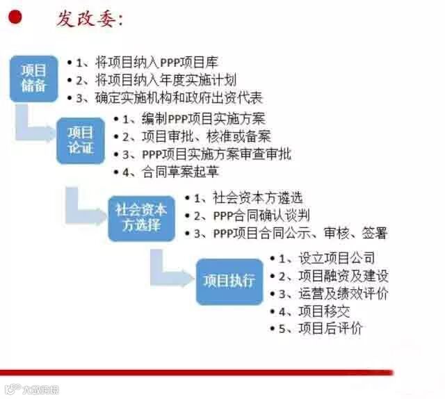 2014年11月29日,财政部印发《政府和社会资本合作模式操作指南》(试行),将PPP项目流程分为项目识别、项目准备、项目采购、项目执行和项目移交五个阶段。2016年10月24日,发改委印发《传统基础设施领域实施政府和社会资本合作项目工作导则》,将PPP项目流程分为项目储备、项目论证、社会资本方选择、项目执行四个阶段。PPP操作实务以图表的形式,对财政部、发改委PPP项目的流程及所需的文件进行梳理。