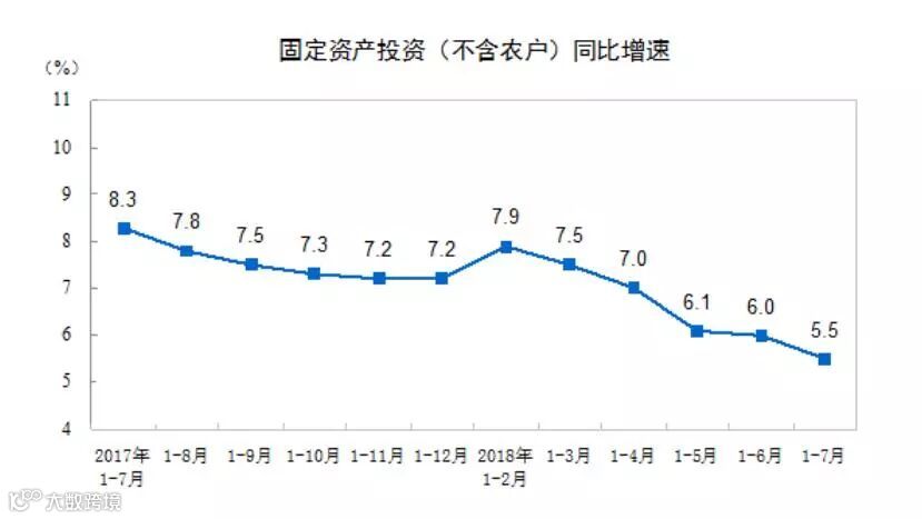 5.5%的增速,创下一年来的新低。历来中国是投资支撑型的经济,投资增速一直是GDP增速的2倍。即便达不到,也超过GDP的增速。上半年,GDP增速是6.8%,这5.5%的投资增速。这回各方急了。