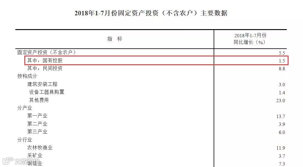 此图就更加清晰展示了“谁让投资增速下滑”的问题。民间投资增速同比增长了8.8%,而“国有控股”(政府、国企)只有1.5%的增长。这个增速,也是近年来非常罕见的低。