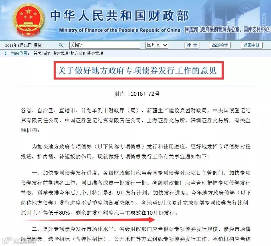 8月14日,财政部发布《关于做好地方政府专项债券发行工作的意见》,意见要求,加快地方政府专项债券发行和使用进度,更好地发挥专项债券对稳投资、扩内需、补短板的作用。各地至9月底累计完成新增专项债券发行比例原则上不得低于80%,剩余的发行额度应当主要放在10月份发行。
