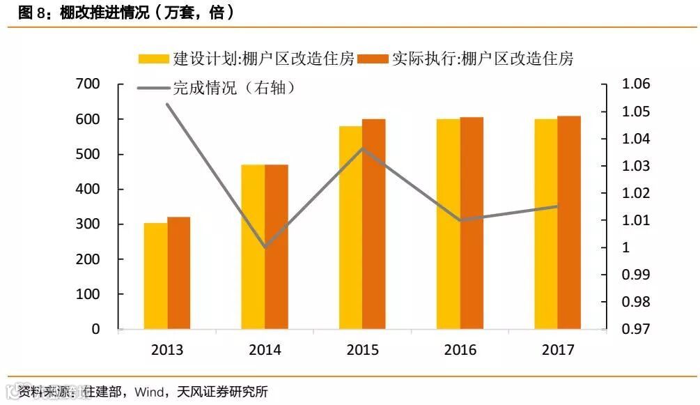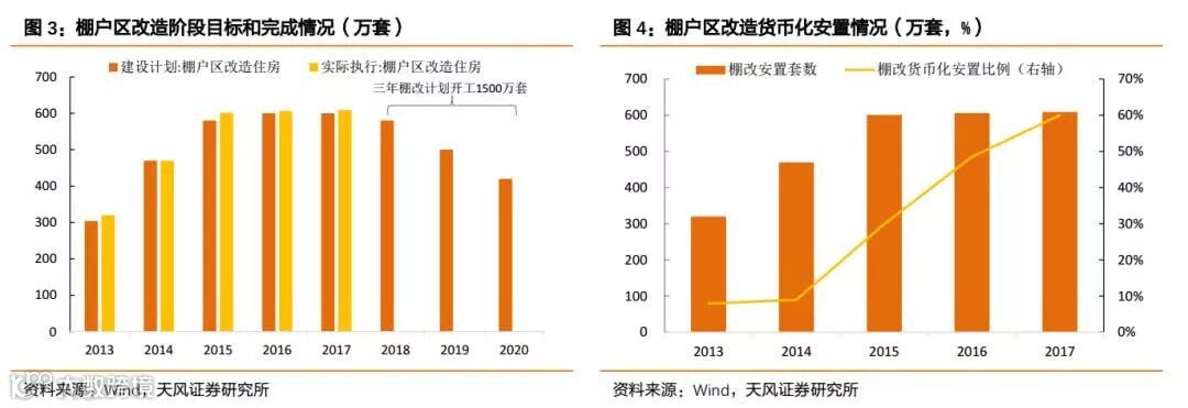 近年来,棚户区改造基本都超额完成,2017年5月24日国务院常务会议提出实施2018-2020年3年棚改攻坚计划,再改造各类棚户区1500万套,加大中央财政补助和金融、用地等支持,由于推高三四线城市房价的主要因素是棚户区改造货币化安置而非棚户区改造,而且棚户区改造作为重要的民生工程,因此棚户计划套数改变的可能性相对较小,但是各地方政府新增棚改项目的建设可能会有所放缓。
