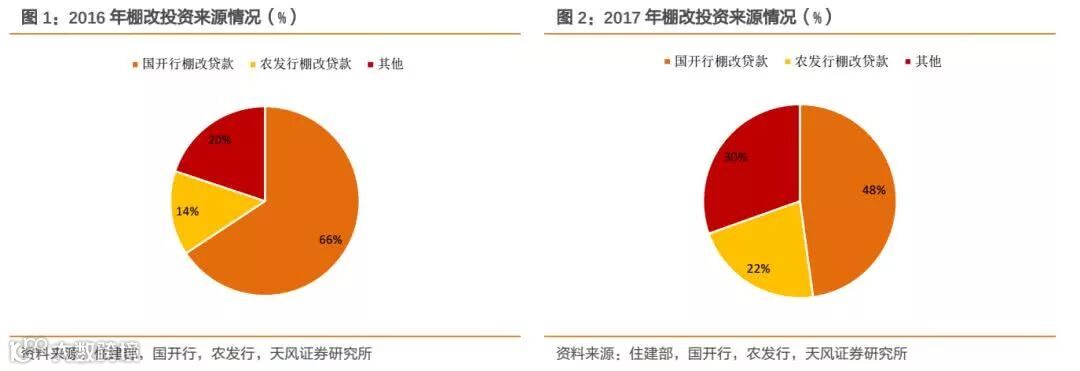 根据住建部统计2016年棚改总投资额14800亿元,2017年棚改总投资额18400亿元,16、17年两大政策性银行棚改贷款发放规模占总投资额比重分别为80%和70%,国开行在其中又占据主导地位,16、17年国开行棚改贷款占总投资额比重分别为66%和48%。