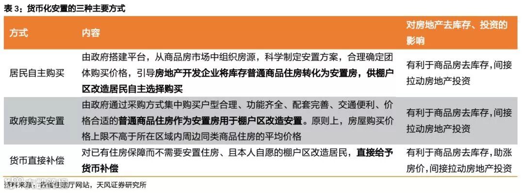 货币化安置是指在拆迁棚户区住宅房屋时,拆迁人将应当用以安置的房屋按规定折算成安置款,由被拆迁人选购住宅房屋自行安置的方式。货币化安置可以直接拉动当地商品房销售,带动去库存,棚改拆迁后形成的刚需购房群体进入到商品房市场,也会刺激房价上涨,开发商进一步补库存,间接拉动地产投资。