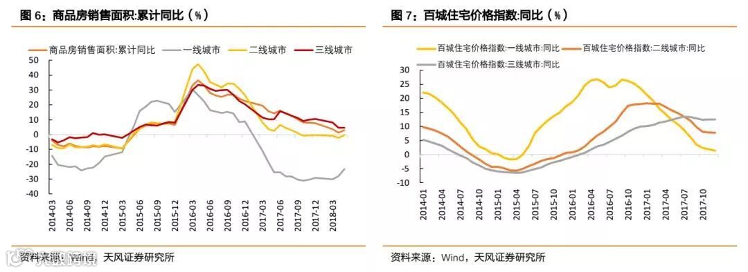 棚改货币化安置带动三四线房地产市场量价齐升。分城市销量来看,2015年后,一二线城市商品房销售下滑明显且出现负增长,而三线城市对商品房销售起到一定的支撑作用。2018年5月,四十大中城市中,一、二、三线城市销售同比分别为-23.28%、-0.43%和4.60%。分城市房价来看,2016年10月份地产调控周期开启后,一二线城市住宅价格同比回落,三线城市住宅价格指数同比仍然继续攀升,2017年8月,三线城市住宅价格指数同比增速超过一线城市和二线城市,达到13.36%,并在之后持续上行。