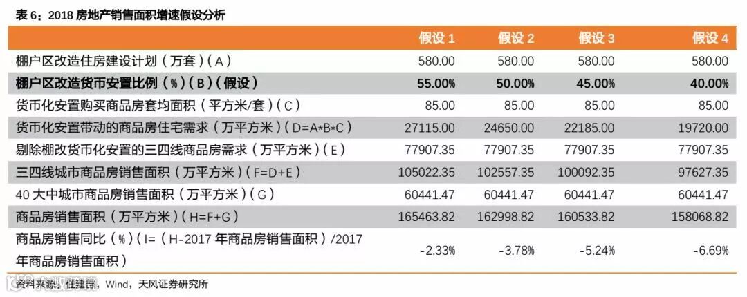 假设2018年货币化安置比例分别为55.00%、50.00%、45.00%和40.00%,并假设剔除棚改货币化安置的三四线商品房需求同2017年相同(E=2017年商品房销售面积-2017年40大中城市商品房销售面积-2017年棚户区改造货币化安置带动的商品房住宅需求),40大中城市商品房销售面积同2017年相同(2017年40大中城市商品房销售面积),可以得到在这几种情形下,2018年商品房销售同比增速分别为-2.33%、-3.78%、-5.24%和-6.69%。