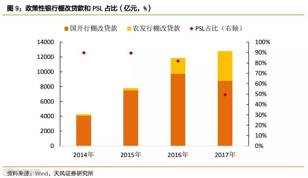 2014-2016年占两大政策性银行棚改贷款比例分别为90%、90%和82%,17年PSL投放总量为6350亿,占比开始大幅下降,仅为50%。