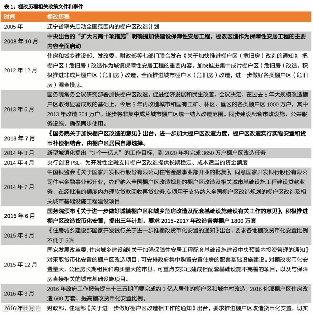 2005年辽宁率先启动全国范围内的棚户区改造计划。2008年10月中央出台“扩大内需十项措施”中明确提出加快建设保障性安居工程,棚户区改造作为保障性安居工程的主要内容全面启动。2013年7月,《国务院关于加快棚户区改造的意见》出台,进一步加大棚户区改造力度。2015年6月,国务院颁布《关于进一步做好城镇棚户区和城乡危房改造及配套基础设施建设有关工作的意见》,积极推进棚户区改造货币化安置。