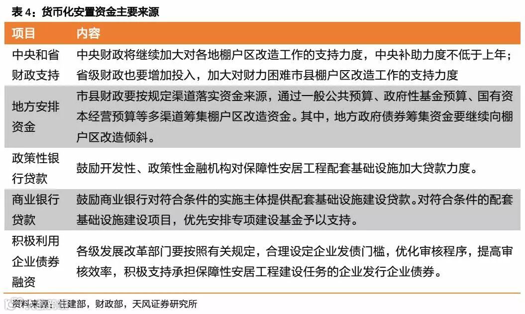 棚改货币化安置资金由多渠道筹措配置,主要包括:地方政府投入、金融机构贷款、企业债券融资等。
