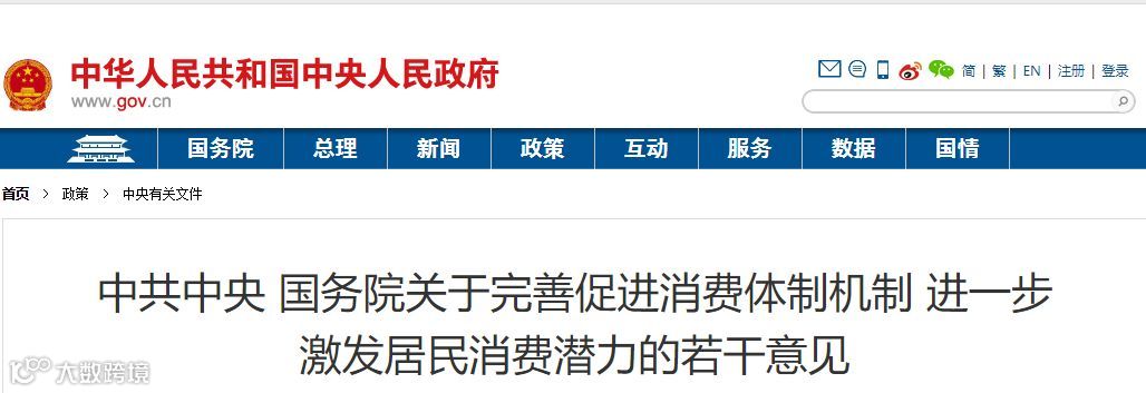 中共中央国务院印发“进一步激发居民消费潜力若干意见”