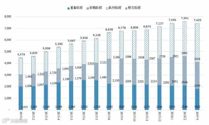 PPP项目流程大致可分为5个阶段,项目发起、项目准备、项目采购、项目执行、项目移交。根据财政部官方数据显示,截至2018年3月末累计项目总数7,420个、投资额11.5万亿元,储备清单项目5,721个,投资额6.1万亿元。