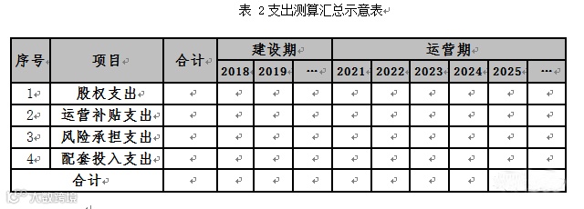支出测算是根据各类支出责任的特点、情景和发生概率等因素,对项目全生命周期内财政支出责任分别进行测算。本节根据责任识别情况分别对股权投资、运营补贴、风险承担、配套投入四部分支出进行合理测算,以表格形式分年度列明政府各项支出及支出责任总额,并注重区分建设期和运营期支出。