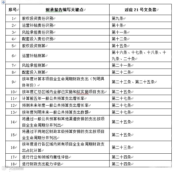 本次财承报告规范性分析,仅对财承报告编写形式是否规范进行分析,不讨论财政支出实际测算过程的规范性。根据财金[2015]21号文(以下简称“21号文”)规定,财承报告编写应包含以下18项关键点: