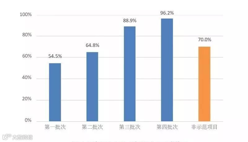 截至2018年1月末,管理库中国家级示范项目共1093个,财承报告编写规范的项目共954个,总体规范率达到87.3%。其中,第一、二批示范项目由于财承论证完成时间较早,规范程度相对较低,第三、四批示范项目财承报告规范率逐步提高到90%左右,高于非示范项目[2]的70.0%。国家级示范项目在财承论证工作中发挥了较好的示范带头作用。(图6)