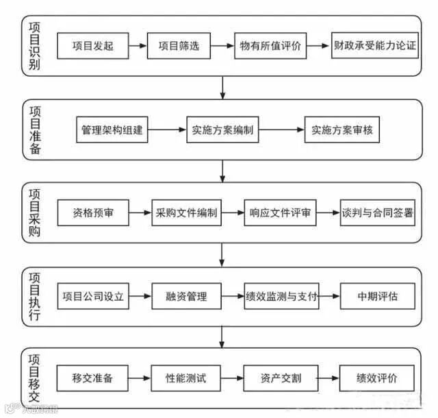 按照财政部发布的《政府和社会资本合作模式操作指南(试行)》(财金〔2014〕113号)(简称《操作指南》),将PPP模式的操作程序分为5个阶段:项目识别、项目准备、项目采购、项目执行和项目移交。五个阶段按照PPP项目操作逻辑前后连接,形成完整的PPP项目采购流程,其中任何一个阶段出现问题,都可能导致PPP项目失败。