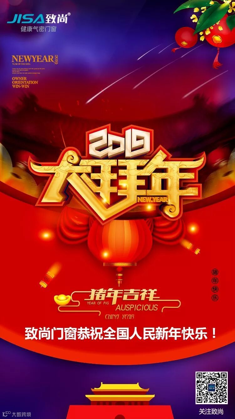 爆竹声响,春回大地,欢声笑语辞旧岁,万马奔腾迎新春!新年的钟声即将敲响,在这万家团聚的日子里,致尚门窗给全国人民拜年了!恭祝全国人民新年新气象,福星高照,财运亨通,身体健康,幸福美满,猪年吉祥!新的一年里,致尚门窗伴您左右,全力以赴,为缔造健康人居生活而不断前行!