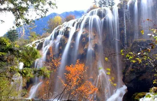 童话般的绚丽色彩,使你更加地妩媚;那蓝蓝的池水,使你更显得柔美。蜿蜒在九寨沟森林中的栈道,仿佛是一条丝线,把沿线的美景串成了一条光彩夺目的项链。