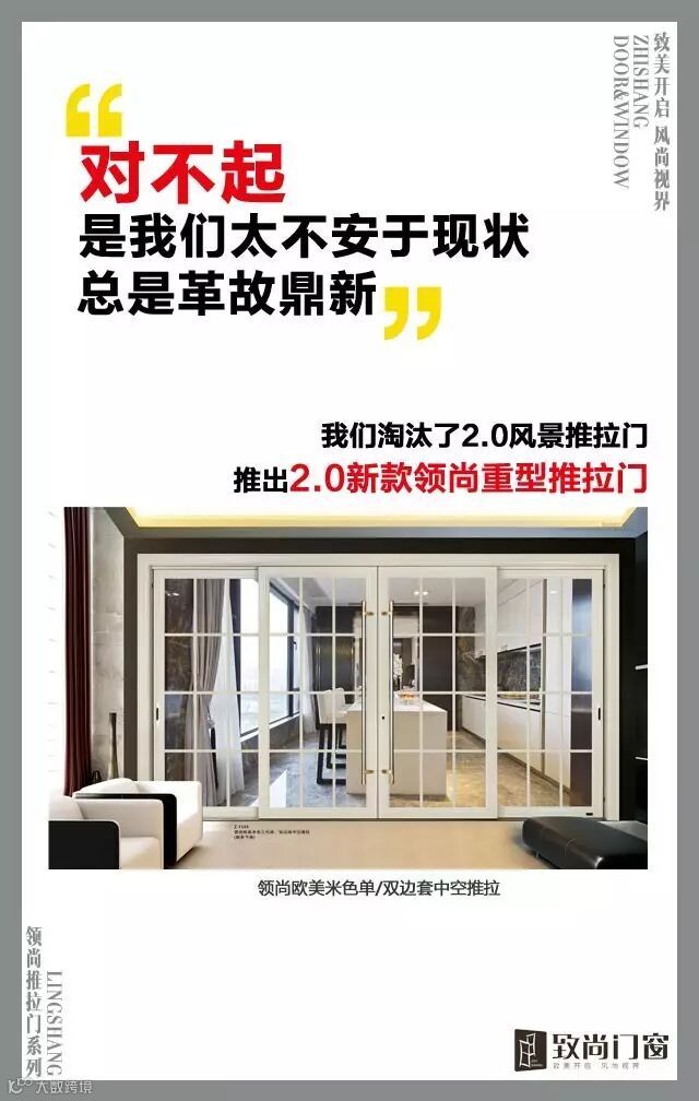 兹我司2009年推出的《2.0风景推拉门》系列产品,目前已失去产品市场的竞争力。随着公司2.0新款领尚重型推拉门的推出,不仅改进了产品外观、结构、工艺、配置、扇宽和中空层都加大了,进一步加强了产品的核心竞争力,广受全国消费者的青睐!更加促进了产品的更新换代。