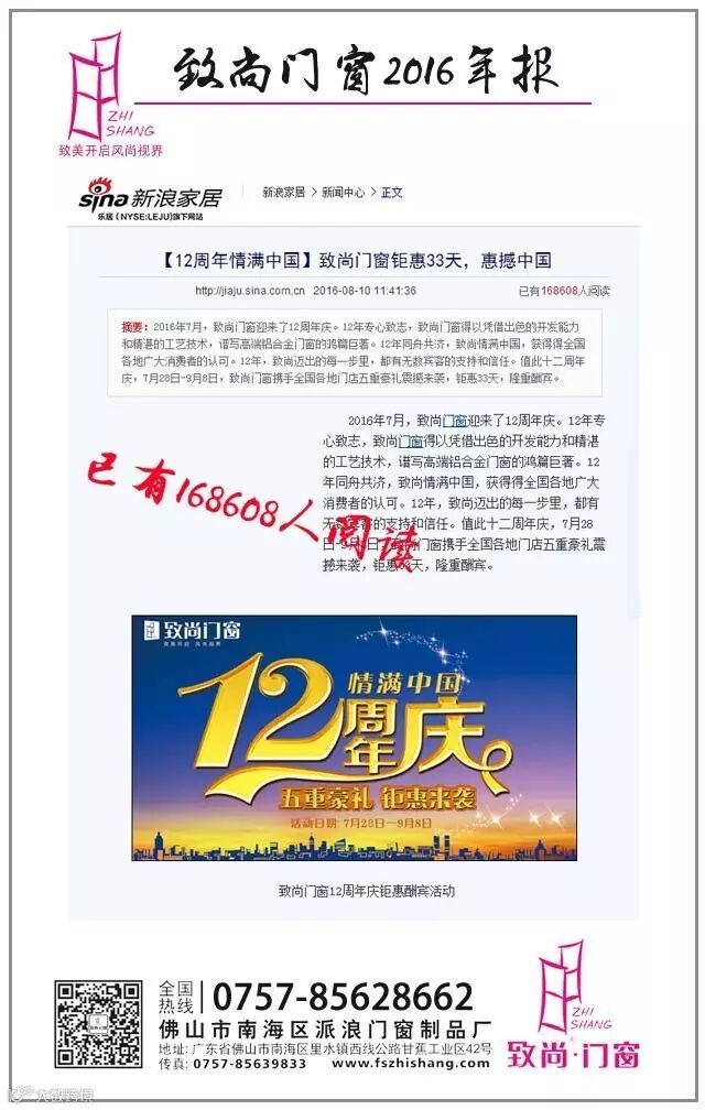 12周年庆,要感恩的人与事有太多,致尚门窗选择用尽洪荒之力,携手经销商伙伴一起放“价”钜惠酬宾。拳拳诚意暖人心,致尚获得国内主流媒体平台新浪家居168608用户的关注。感恩用户,致尚让时尚高端铝合金门窗更亲民,更具性价比,刷新了消费者满意度。