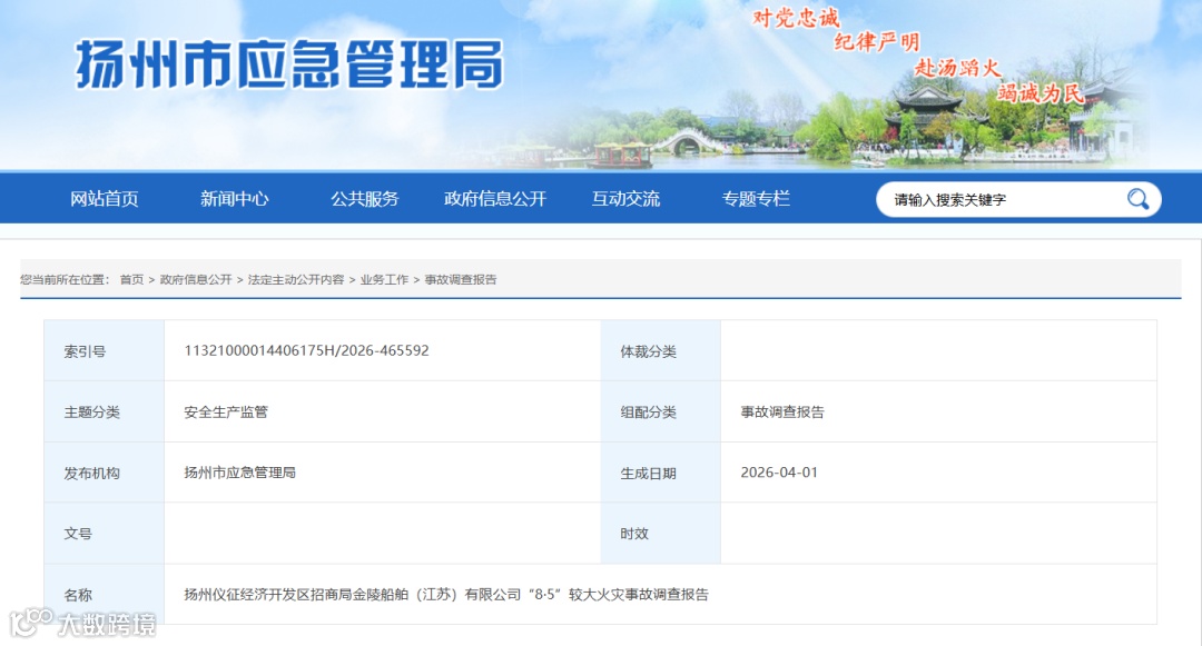 4月1日,扬州市应急管理局公布了《扬州仪征经济开发区招商局金陵船舶(江苏)有限公司“8・5”较大火灾事故调查报告》。