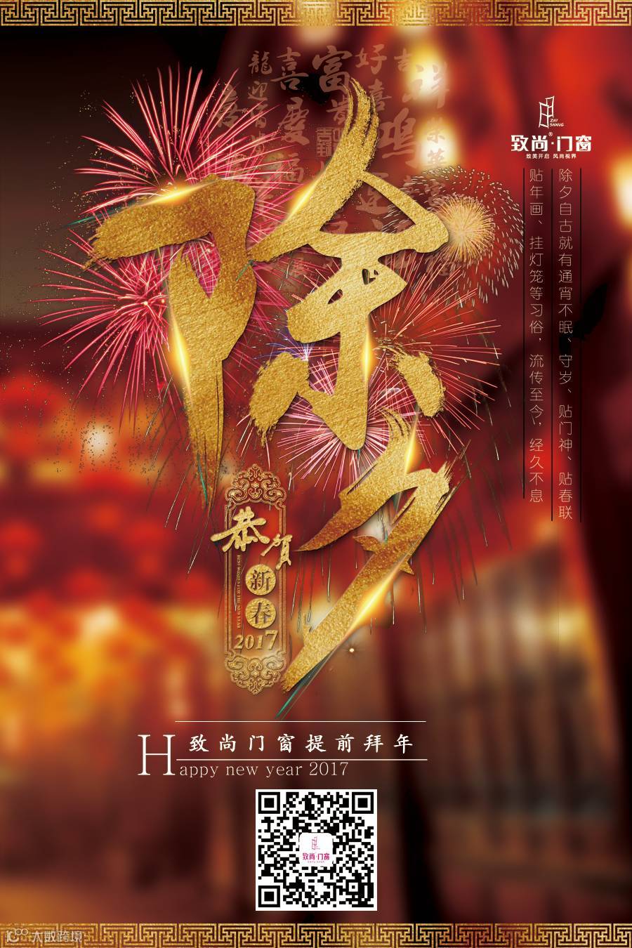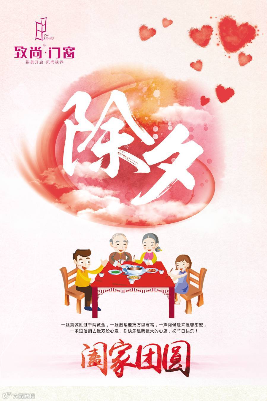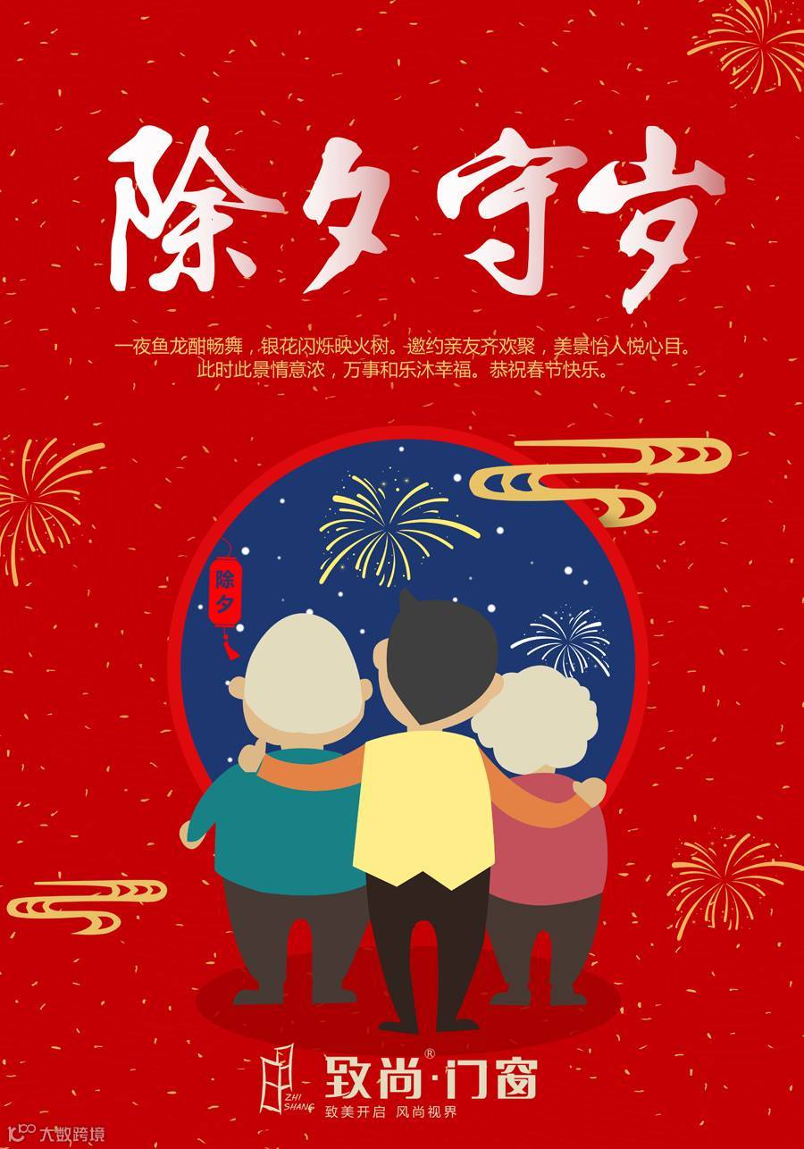 辞旧迎新,团圆守岁时的温馨幸福,少不了祝福相伴。除夕围炉团圆齐守岁,致尚门窗提前拜年送祝福。故岁今宵尽,新年明旦来。新年来临之际,致尚门窗祝愿大家万事如意,阖家安康。