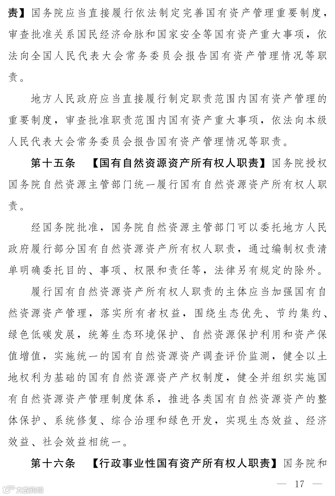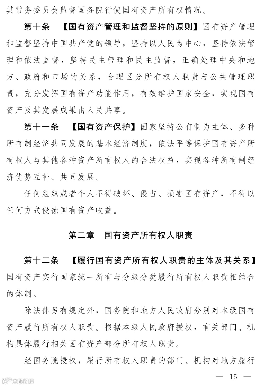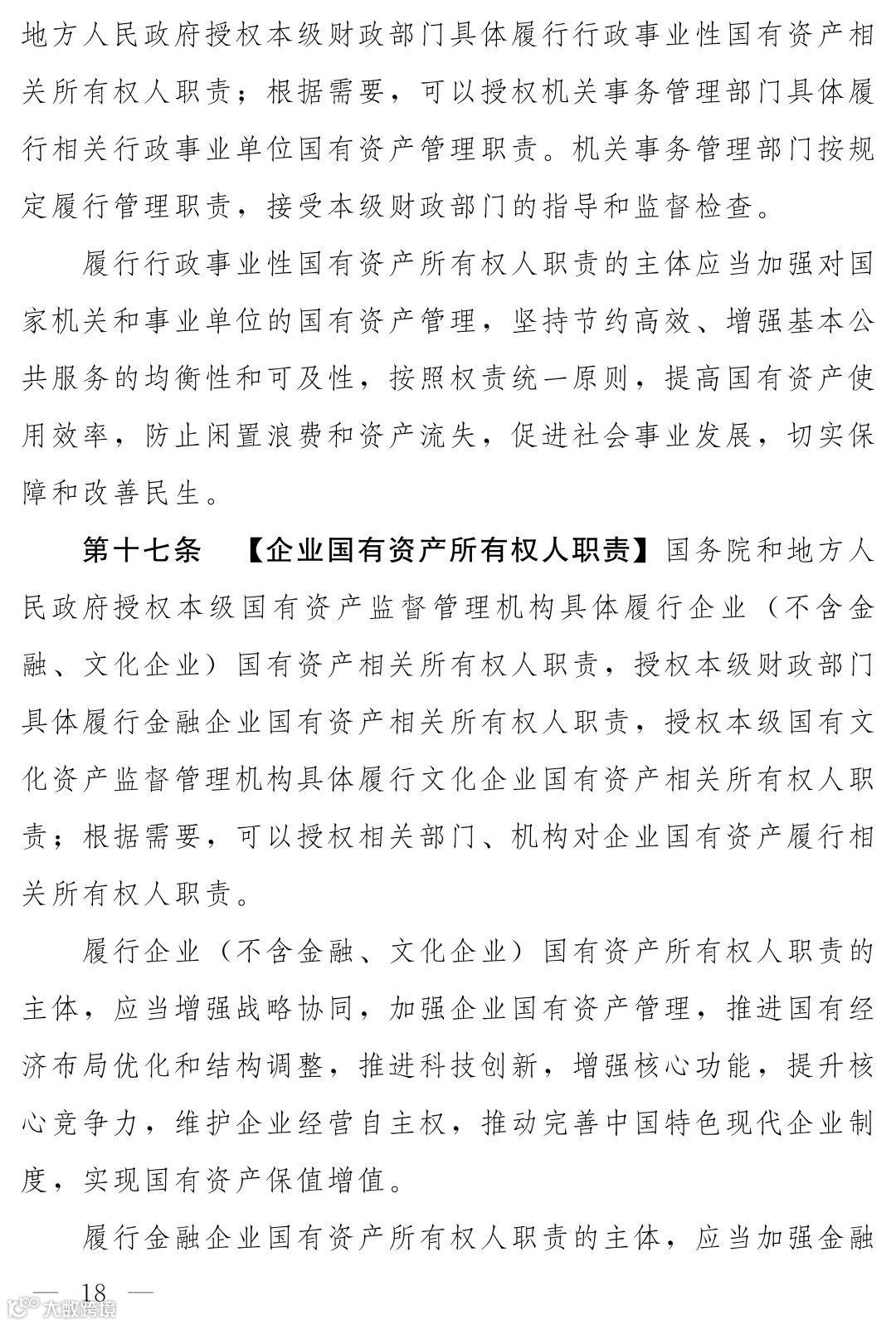 《国有资产法》(草案)核心概念升格为“国有资产所有权人职责”。确立“国家统一所有与分级分类履行所有权人职责相结合”的体制。