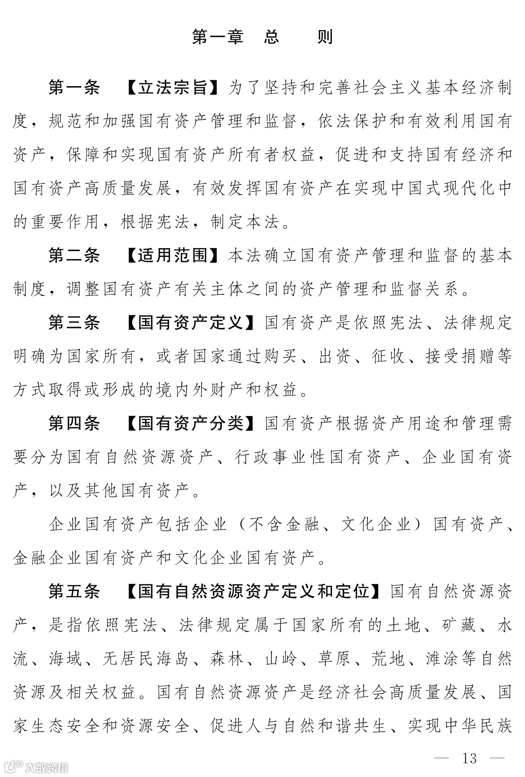 《国有资产法》(草案)确立国有资产管理和监督的基本制度,调整国有资产有关主体之间的资产管理和监督关系,调整范围扩展至全部国有资产。明确将国有资产分为四类:国有自然资源资产、行政事业性国有资产、企业国有资产(进一步细分为非金融文化企业、金融企业、文化企业)、以及其他国有资产。首次在法律层面将自然资源资产、行政事业性资产纳入统一基础制度框架。