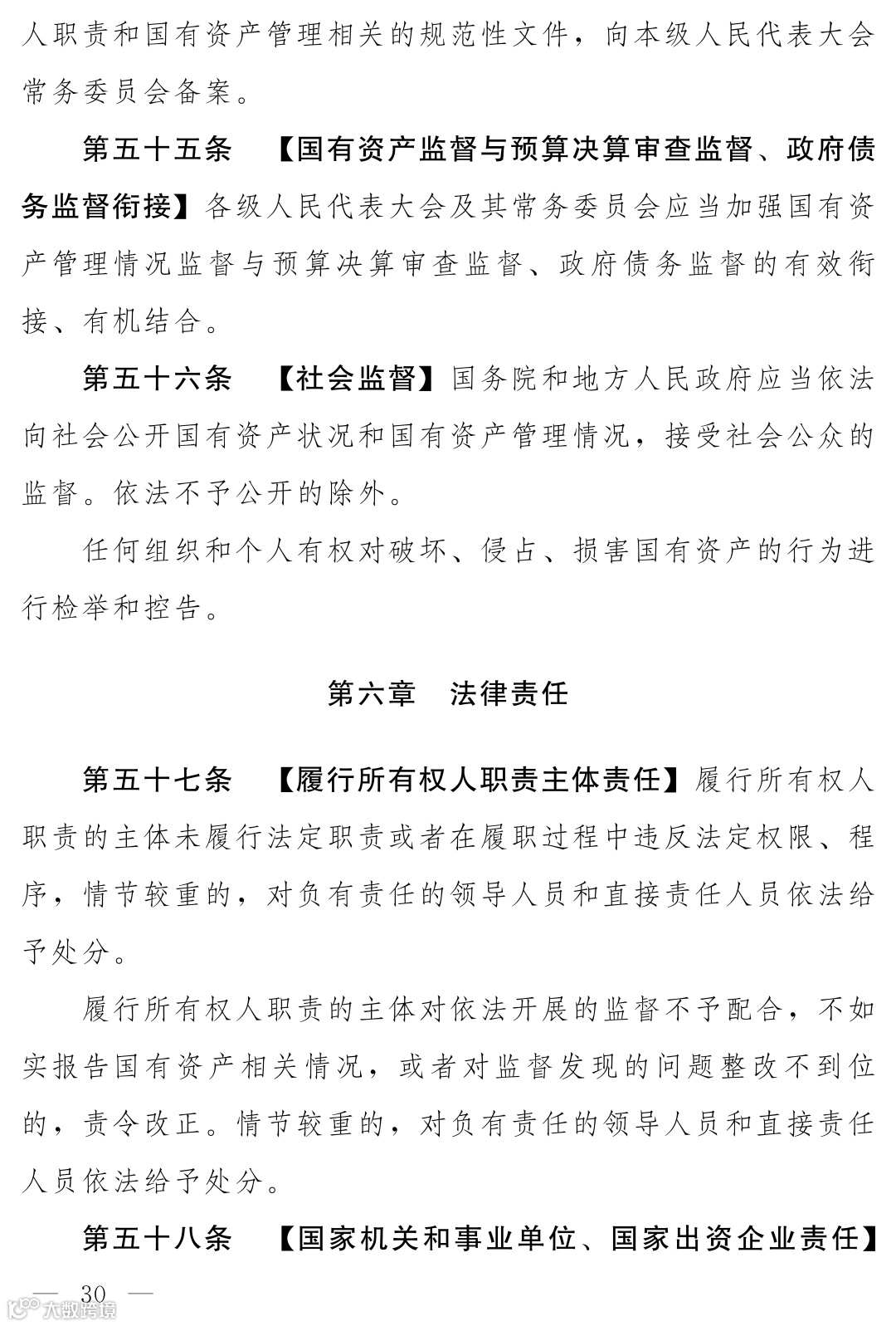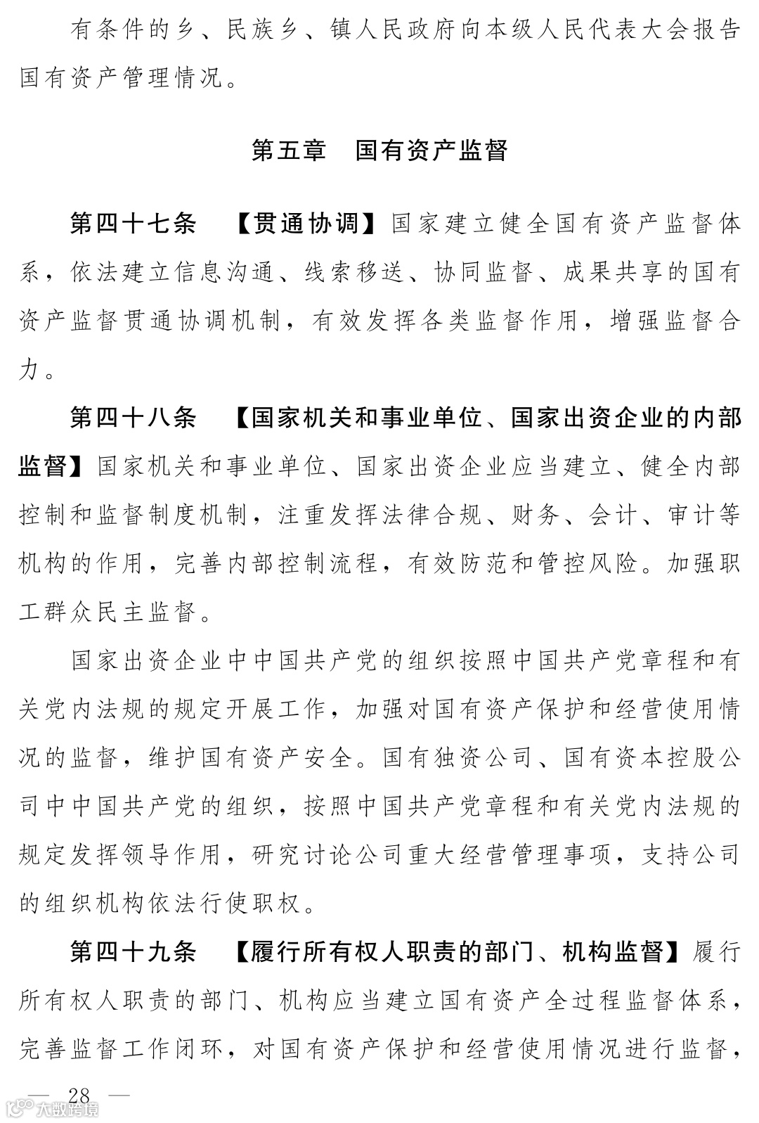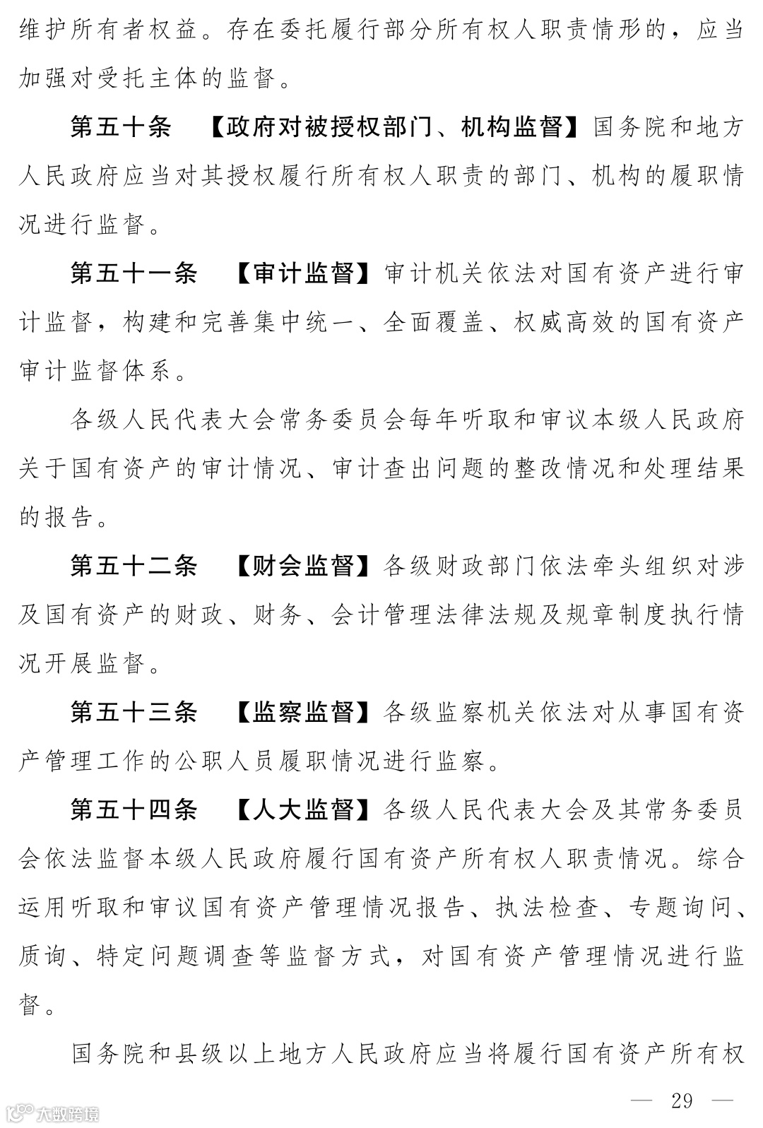 《国有资产法》(草案)专设“国有资产监督”一章,构建了党的监督引领下,内部监督、所有权人监督、政府监督、审计监督、财会监督、监察监督、人大监督、社会监督等各类监督方式贯通协调的“大监督”体系。明确要求建立信息沟通、线索移送、协同监督机制,形成监督合力。