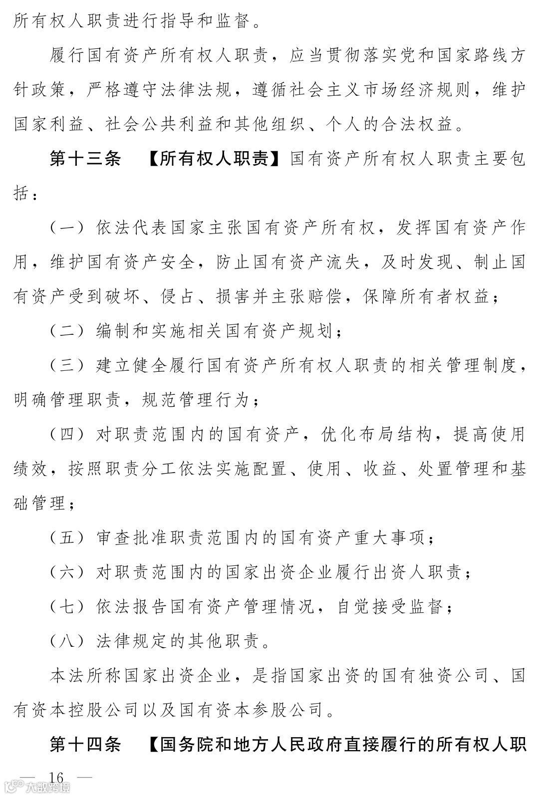 职责范围:所有权人职责(第十三条)远超出资人职责,涵盖资产主张、规划编制、制度建立、布局优化、配置处置、基础管理、审查批准重大事项、报告与接受监督等全方位管理责任。
