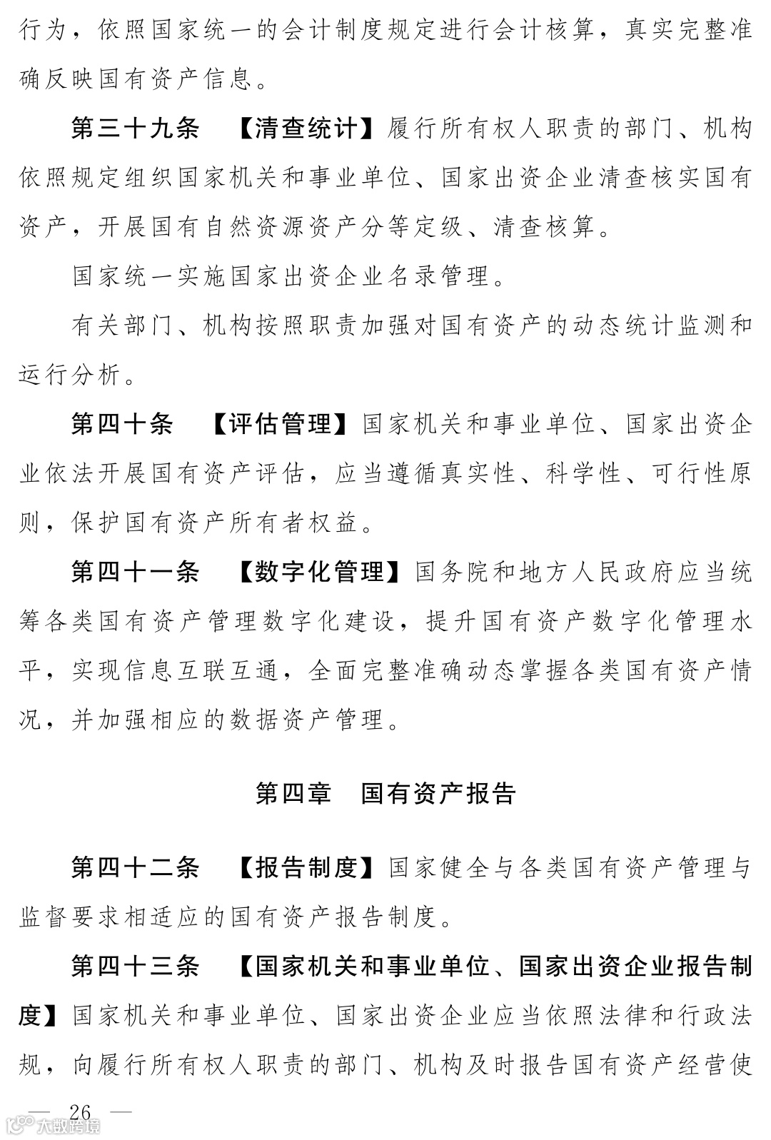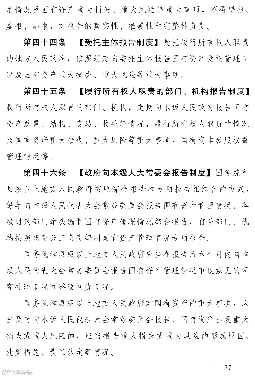 国有资产报告制度专章,系统构建了从资产占用单位、到履行所有权人职责的机构、再到各级政府、最终每年向本级人大常委会报告的全链条、常态化报告制度,并明确了综合报告与专项报告相结合的方式,极大增强了管理透明度和问责刚性。