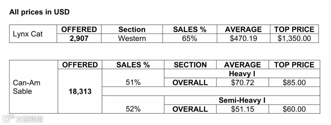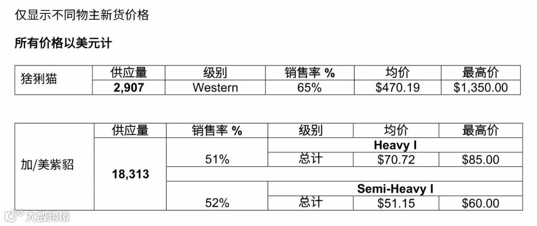 之前供应的18313张加/美紫貂精选系列销售率为50%,质量更好、尺寸更大的加/美紫貂皮主要被韩国买家竞得,尺寸较小的加/美紫貂皮主要被希腊买家竞得。