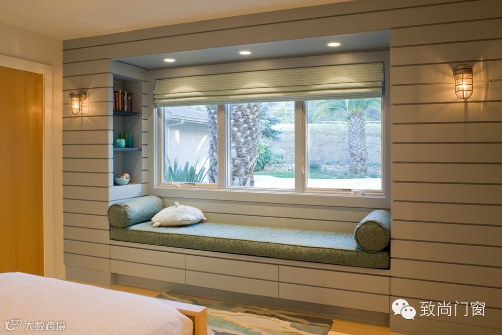 2、飘窗处一般光照充足,因此,台面需要考虑耐晒,不然会导致变色、变形;由于冬天室内外温差很大,飘窗处会有冷凝水出现,要避免所用材质因受潮而变形。台面最好选择大理石等石材或桑拿板,既防水防晒又好打理,避免出现以上问题。如果选择大理石台面,可在上面搭配一些靠垫和垫子,这样在上面坐着、躺着都不会感觉太冰冷。