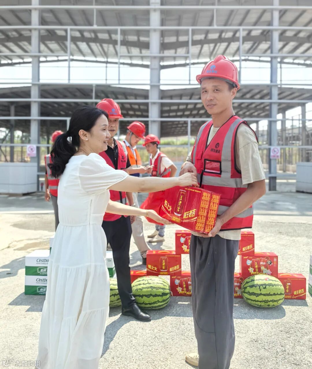 在炎炎夏日里,工地的温度持续攀升,但大家对待工作的热情与干劲却丝毫未减。他们身着厚重的工作服,挥汗如雨,为项目的顺利推进贡献着自己的力量。为表达对员工的敬意与感谢,合盛公司工会精心准备了清凉饮料、水果等慰问品,希望能为大家带来一丝凉爽与舒适。