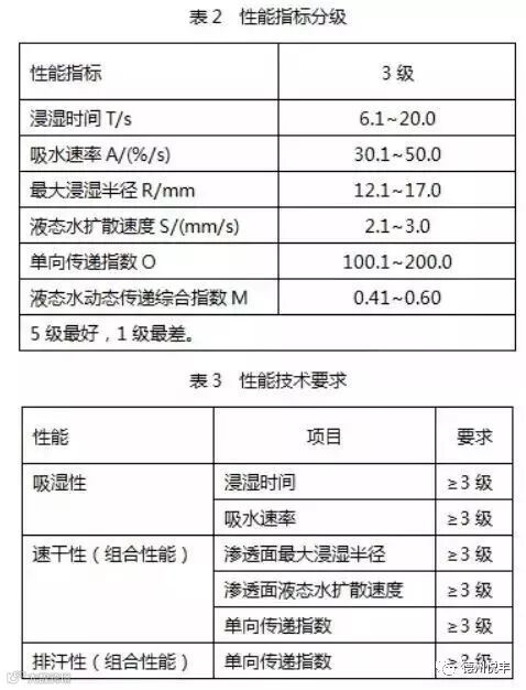 根据仪器所测得的各性能指标值评级,定级后查阅表3最终确定纺织品性能(吸湿速干性/吸湿排汗性)。