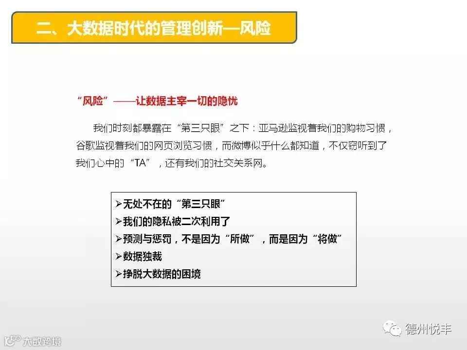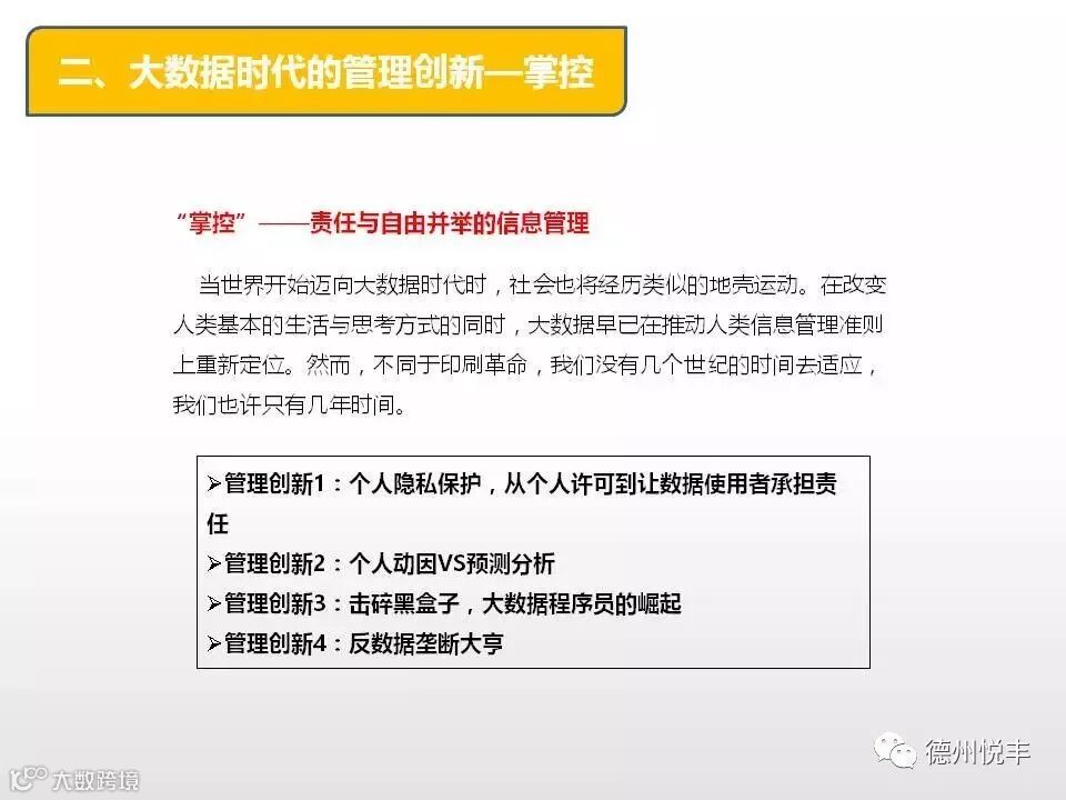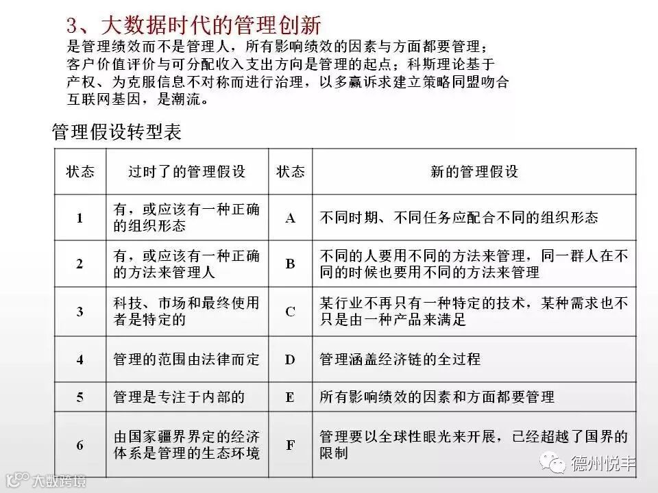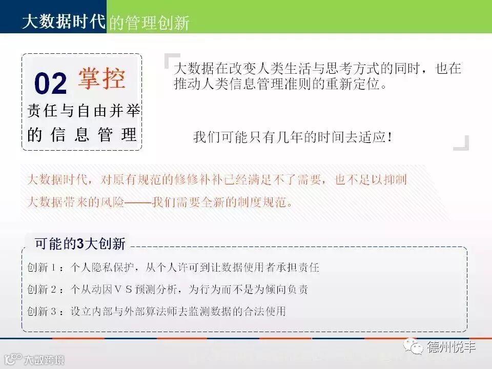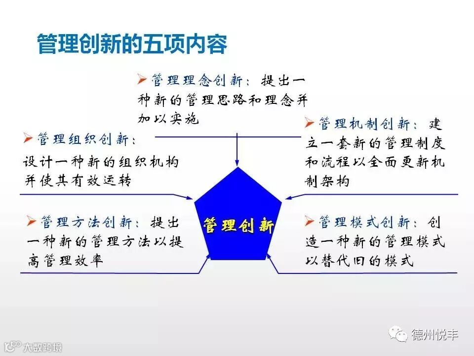 大数据时代的管理创新,是指在无法预知的多种信息交汇中取得可以肯定的、能达到预期结果的管理方法。管理创新首要的是思维创新,也包含制度创新、文化创新和技术创新。