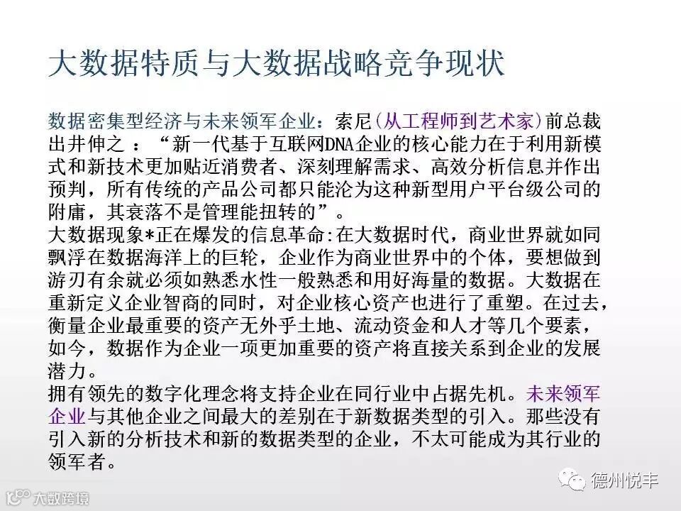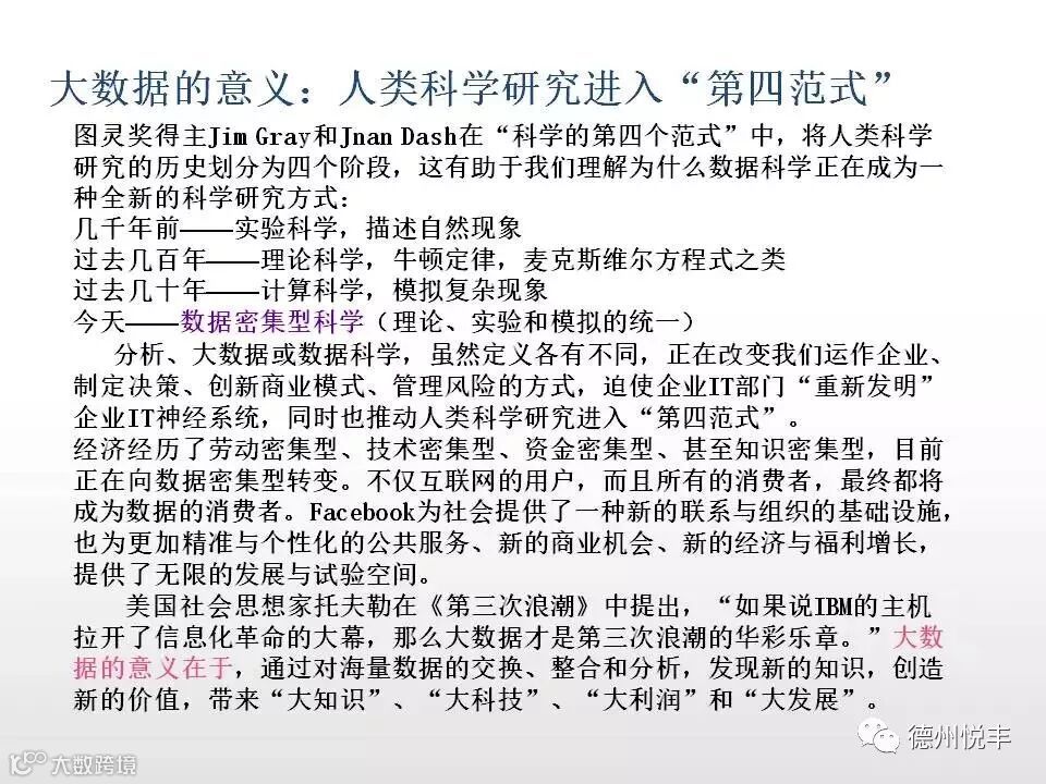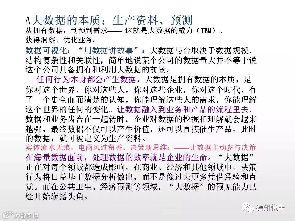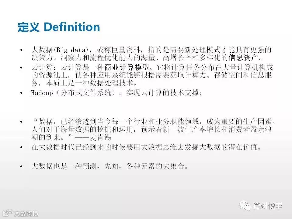 对于“大数据”(Big data)研究机构Gartner给出了这样的定义。“大数据”是需要新处理模式才能具有更强的决策力、洞察发现力和流程优化能力的海量、高增长率和多样化的信息资产。大数据技术的战略意义不在于掌握庞大的数据信息,而在于对这些含有意义的数据进行专业化处理。换言之,如果把大数据比作一种产业,那么这种产业实现盈利的关键,在于提高对数据的“加工能力”,通过“加工”实现数据的“增值”。