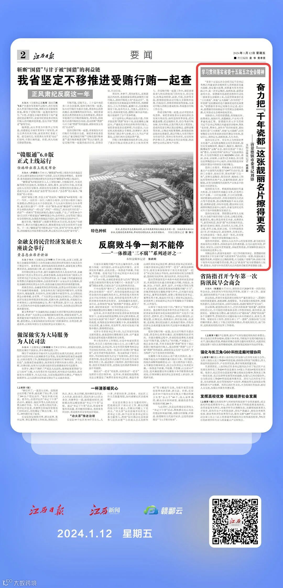 “省委十五届五次全会把习近平总书记考察江西重要讲话精神深入贯彻到谋划重大战略、制定重大政策、部署重大任务的实践之中,是一次牢记嘱托、抢抓机遇、感恩奋进的大会。景德镇市迅速把思想和行动统一到省委全会精神上来,全面贯彻省委打造‘三大高地’、实施‘五大战略’,担当好把‘千年瓷都’这张靓丽的名片擦得更亮的光荣使命。”景德镇市委书记刘锋告诉记者,连日来,景德镇市持续掀起学习贯彻全会精神热潮,扎实推动全会精神落地见效。