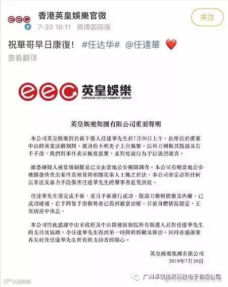 20日18时左右,@香港英皇娛樂官微发布声明证实,任达华被“利刀刺伤其腹部及右手手指”。声明同时透露,任达华已完成手术,手术进行成功,腹部刀伤轻微伤及内脏,已成功缝补,右手四只手指伤势也得到适当治疗,目前身体情况稳定,正在病房中休息。