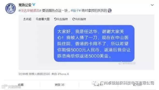 在一片关注声中,有人居然借此事蹭热点。对此,常熟市公安局官方微博@常熟公安20日下午公布了一例带有恶搞风格的“诈骗”短信。