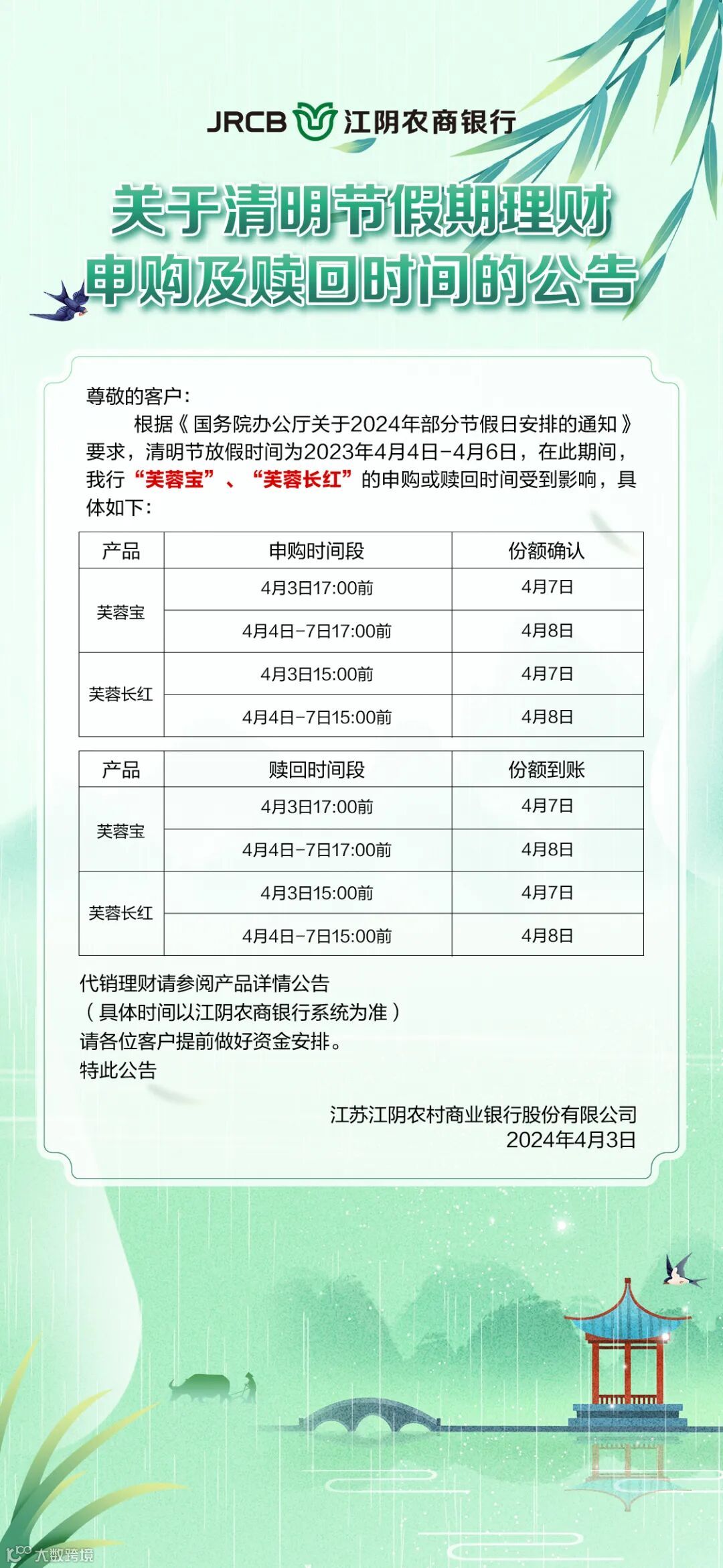 公告 | 关于清明节假期理财申购及赎回时间的公告