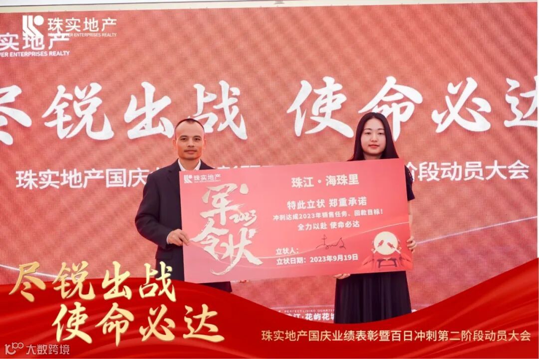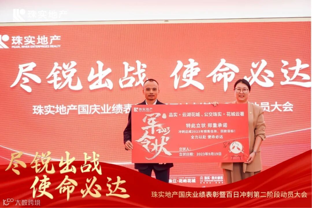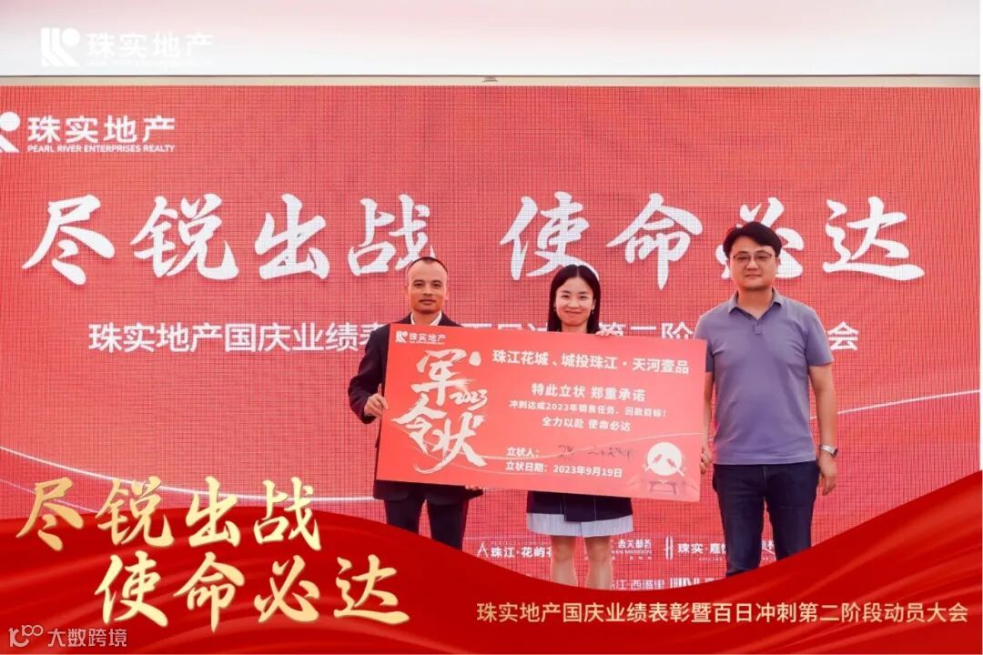 号角催征励精兵,扬鞭奋蹄踏征程,冲锋集结号正式吹响。答恒诚总向营销策划部及湖南公司、安徽公司授予军令状,擂动奋进决战鼓。汪能平总向珠江花城、城投珠江·天河壹品、品实·云湖花城、公交珠实·花城云著、珠实·西关都荟等项目授予军令状,各位负责人拿出勇往直前的决心。随后,帅博总向合富辉煌、中原地产、城服房分、城壹顾问、中地行授予合作军令状。