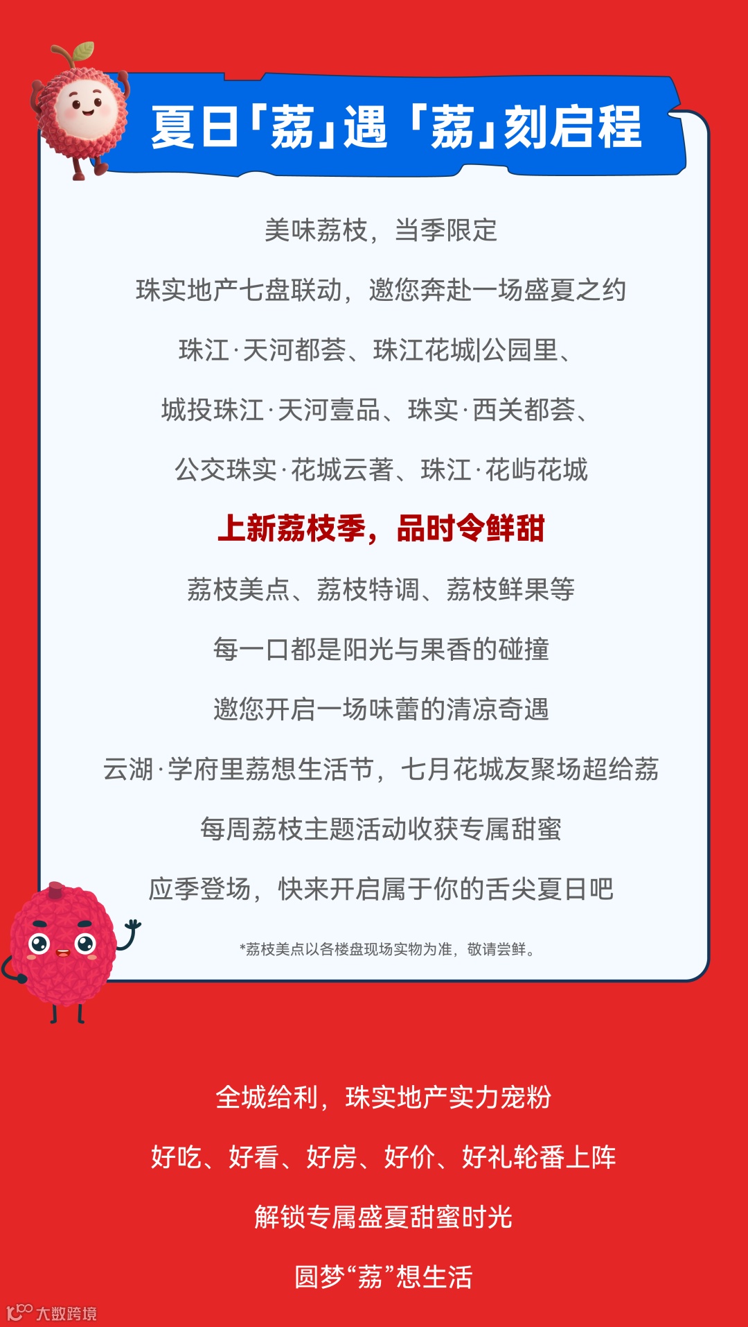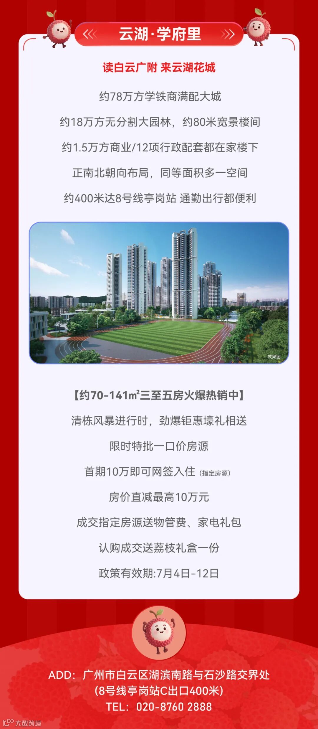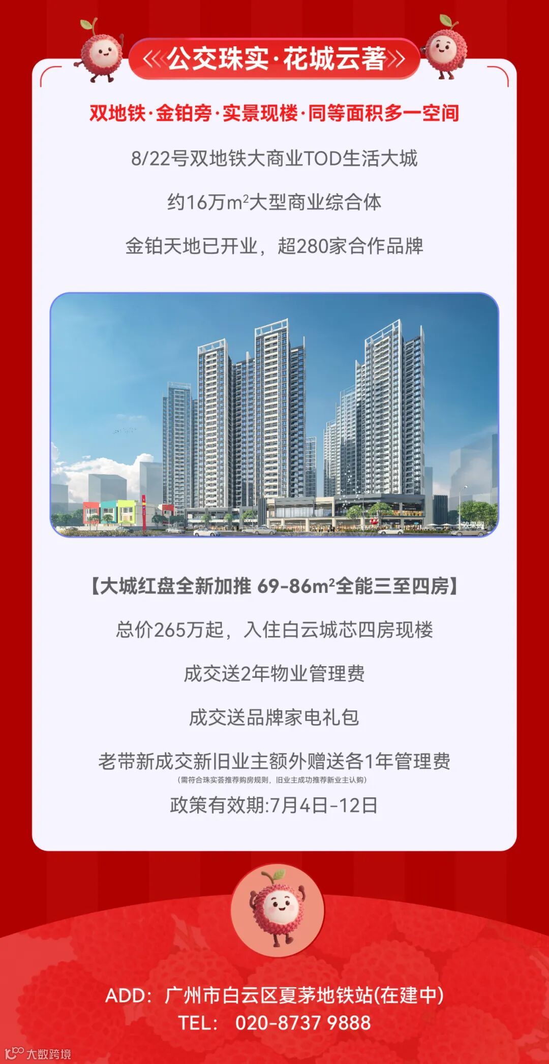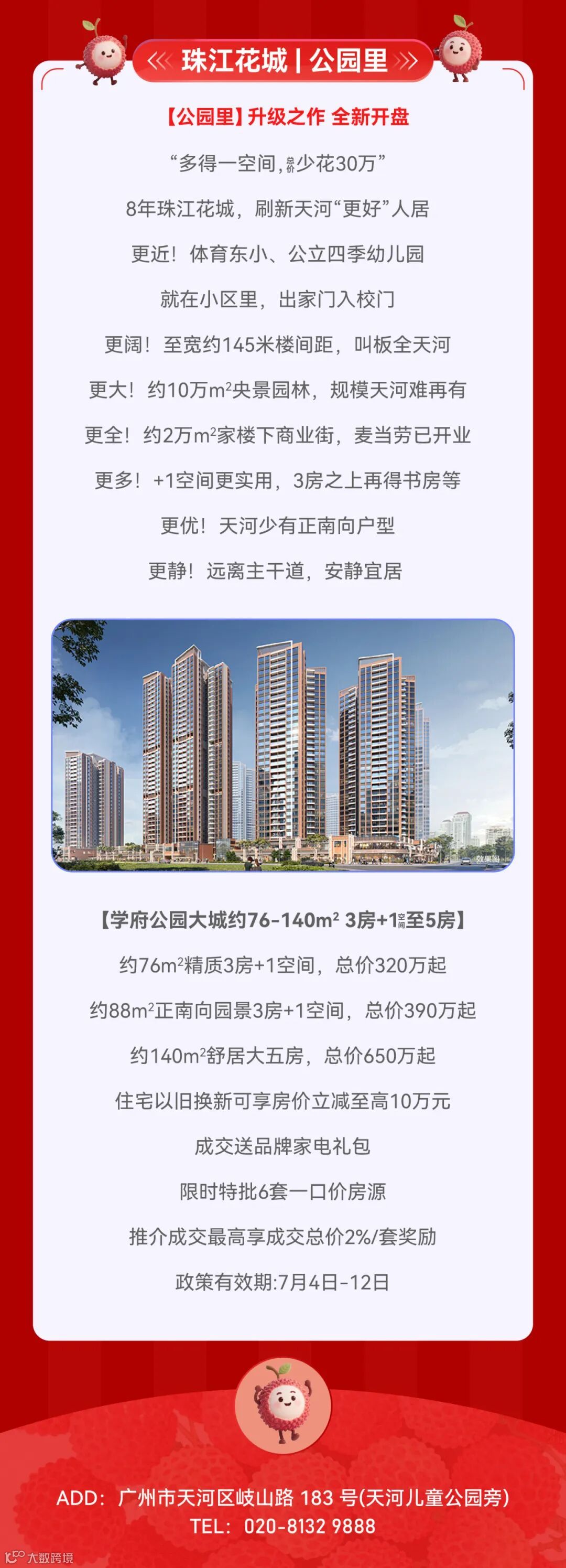 免责声明:1.本宣传资料仅为要约邀请 ,所有文字和图片仅供参考,不作为开发商的销售承诺及要约内容,买卖双方权利义务均以实际签订的商品房合同约定为准。2.本宣传资料对周边环境、政府规划、商业配套、教育资源、地铁、城轨、高速、投资前景等信息为截止于2025年7月的情况,有关介绍仅为提供相关信息,并不作为开发商的销售承诺和要约内容,前述信息可能因政府规划调整及开发商无法控制、预测原因而出现变化,以最新公布的政府文件及相关官方信息为准。3.本宣传资料对项目周边幼儿园、学校等教育配套资源的介绍旨在提供相关信息,并不意味着本公司对就学安排做出承诺。教育资源的名称、办学性质、办学规模、学位位置、开学(班)时间、招生条件、收费标准及招生区域存在调整的可能,应以教育主管部门及办学方颁布的政策规定为准。4.部分图片来源网络,如有侵权,请联系删除。5.本活动宣传推广细则以各楼盘现场执行政策为准。画面中涉及折扣优惠等以各楼盘现场公示为准。天河都荟项目不参与相关购房优惠。6.到访/成交礼品/活动礼品领取以各楼盘现场实物及政策为准,数量有限,领完即止。开发商保留对宣传资料更新、修改的权利,敬请留意最新宣传资料。7.本宣传资料解释权,在相关法律范围内归广州珠实地产有限公司及旗下项目开发商所有。宣传资料制作时间:2025年7月。